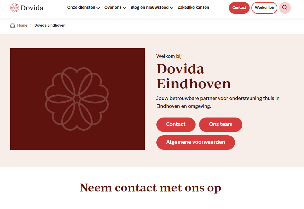 Dovida Eindhoven biedt persoonsgerichte thuiszorg aan ouderen en mensen met een beperking in Eindhoven en omgeving. Met diensten zoals ondersteuning aan huis, persoonlijke verzorging, mantelzorgondersteuning en gezelschap, streeft Dovida ernaar cliënten zo lang mogelijk zelfstandig thuis te laten wonen. Specialisaties zijn onder andere dementiezorg, palliatieve zorg en begeleiding bij chronische aandoeningen. Het team van vaste caregivers biedt zorg op vaste tijden, afgestemd op de wensen en behoeften van de cliënt. Dovida Eindhoven is gevestigd aan de Tarasconweg 2 in Eindhoven en is bereikbaar via 040-3410011 of info.eindhoven@dovida.nl.