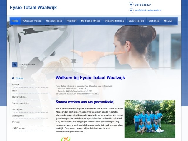 Jaarlijks gaan zo'n 2,5 miljoen mensen, jong en oud, naar de fysiotherapeut. Omdat ze klachten hebben vanwege hun houding of omdat een beweging problemen oplevert. Het kan gaan om sportblessures, klachten opgedaan tijdens het werk, klachten als gevolg van een ongeval, operatie of ziekte, een 'verkeerde' beweging of simpelweg omdat het lichaam ouder wordt. Uw fysiotherapeut adviseert, behandelt en begeleidt u zodat u weer zo goed mogelijk uw dagelijkse leven kunt voortzetten. Gewoon boodschappen doen, op een verantwoorde manier sporten, weer aan het werk of, als u in een instelling verblijft, zelfs eerder naar huis. U leert hoe u door verantwoord te bewegen verdere problemen kunt voorkomen of beperken.