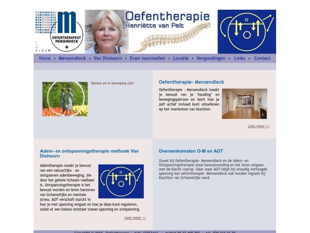De grondlegster van de bewegingsleer is Bess Mensendieck (1864-1957). Mevrouw Mensendieck legde grote nadruk op de eenheid van lichaam en geest. Zij wilde haar cliënten bewust maken van hun houding- en bewegingssituatie. Haar behandelingsfilosofie die uitgaat van de zelfwerkzaamheid van de cliënt sluit goed aan bij de huidige tendens in de gezondheidszorg die er op gericht is de cliënt actief te betrekken bij het zoeken naar de oorzaak van zijn klachten. Sleutelwoorden zijn bewustwording, zelfredzaamheid en ontspanning. Een oefentherapeut maakt je bewust van je lichaam, de houding en manier van bewegen in relatie tot je klachten. Oefentherapie richt zich ongeacht de klacht of aandoening op het gehele lichaam en niet alleen op dat deel van het lichaam waar de klacht zich manifesteert. De behandeling wordt afgestemd op je persoonlijke situatie. Huiswerkoefeningen zijn direct toepasbaar in het dagelijks leven. Zowel je werkomgeving, je thuissituatie, je hobby's en eventueel sporten komen aan de orde. Je zult merken dat je steeds vaker automatisch kiest voor een betere houding en een gezonde manier van bewegen. Kortom: wil je zelf actief aan de slag om klachten te verhelpen dan is de oefentherapeut je bewegingscoach! Oefentherapie wordt gegeven na een verwijzing van een arts of via directe toegankelijkheid. Vergoeding vindt plaats vanuit de aanvullende ziektekostenverzekering. Kinderen tot 18 jaar vallen onder de basisverzekering en bepaalde chronische aandoeningen worden ook vergoed vanuit de basisverzekering. Oefentherapie Mensendieck: