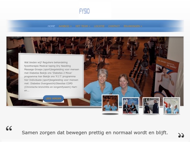 Jaarlijks gaan zo'n 2,5 miljoen mensen, jong en oud, naar de fysiotherapeut. Omdat ze klachten hebben vanwege hun houding of omdat een beweging problemen oplevert. Het kan gaan om sportblessures, klachten opgedaan tijdens het werk, klachten als gevolg van een ongeval, operatie of ziekte, een 'verkeerde' beweging of simpelweg omdat het lichaam ouder wordt. Uw fysiotherapeut adviseert, behandelt en begeleidt u zodat u weer zo goed mogelijk uw dagelijkse leven kunt voortzetten. Gewoon boodschappen doen, op een verantwoorde manier sporten, weer aan het werk of, als u in een instelling verblijft, zelfs eerder naar huis. U leert hoe u door verantwoord te bewegen verdere problemen kunt voorkomen of beperken.